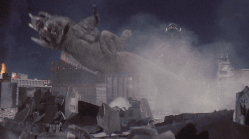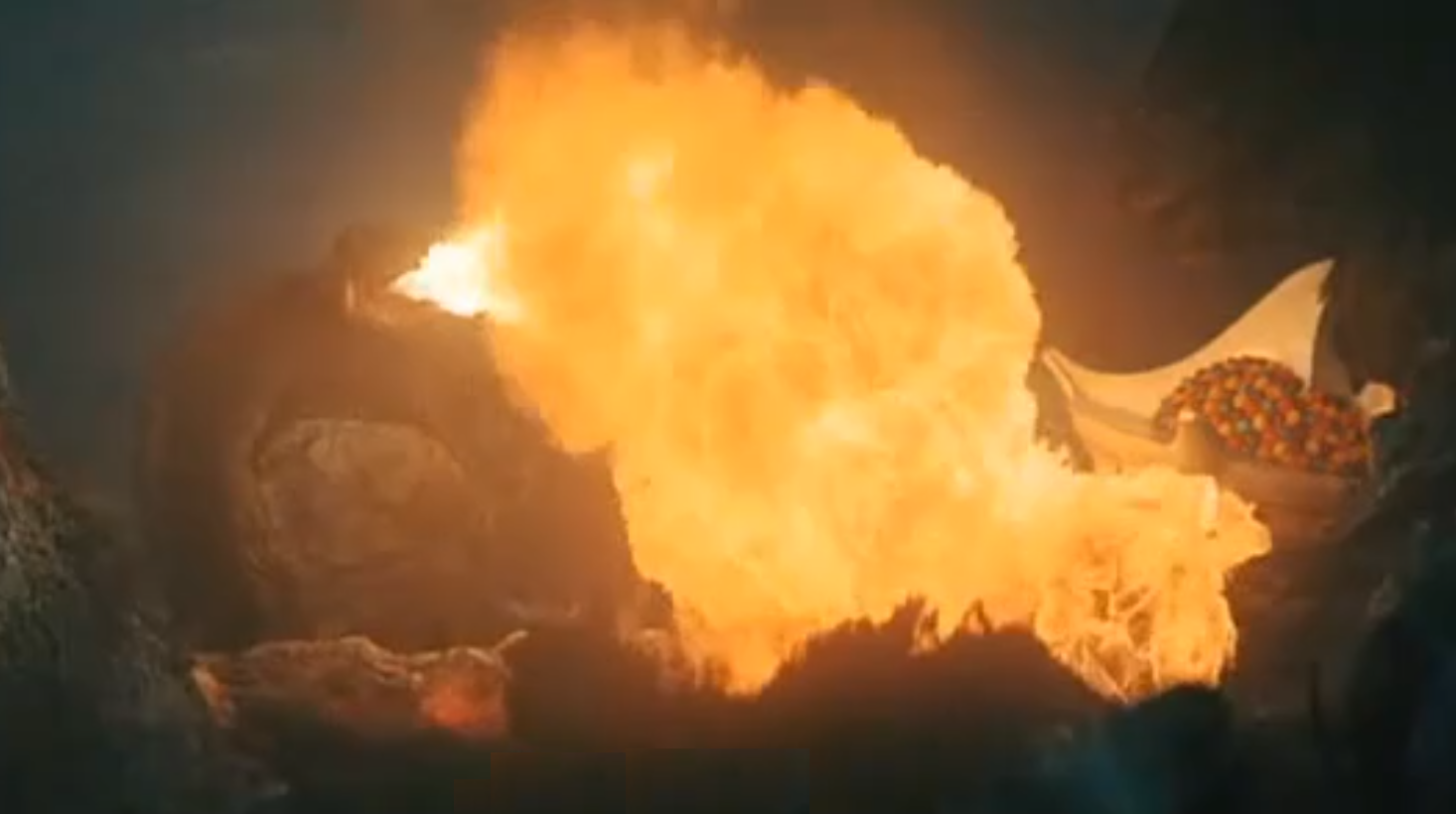 Gamera welding a sliced Terran UFO with a lowered fire breath in Gamera vs. Guiron.
