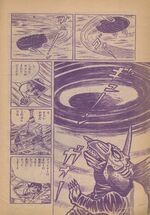 Gamera spinning to form a vortex, producing a vacuum[17] and neutralizing Jiger's ultrasound in the 1970 manga.