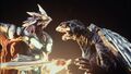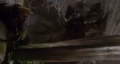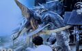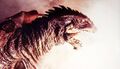 Gamera roaring in agony after Iris impales his hand