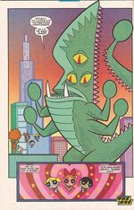 | The Powerpuff Girls | #69 | 2006/02/01 | A monster from Japan looking for the World Ping Pong Championships in Townsville bears a striking resemblance to Guiron, specifically the Showa era version; it has green skin, a blade-like head, and tusks on its lower jaw. However, it also has three eyes on the side of its head and ping pong paddles on all four of its four arms in the place of hands and also on the tip of its long tail. | |