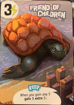 | King of Tokyo (first edition) | One of the cards in this board game is called "Friend of Children," a title associated with Gamera, notably the Showa version of the character. In the first edition of the game, the picture on the card is of a giant sea turtle. | |