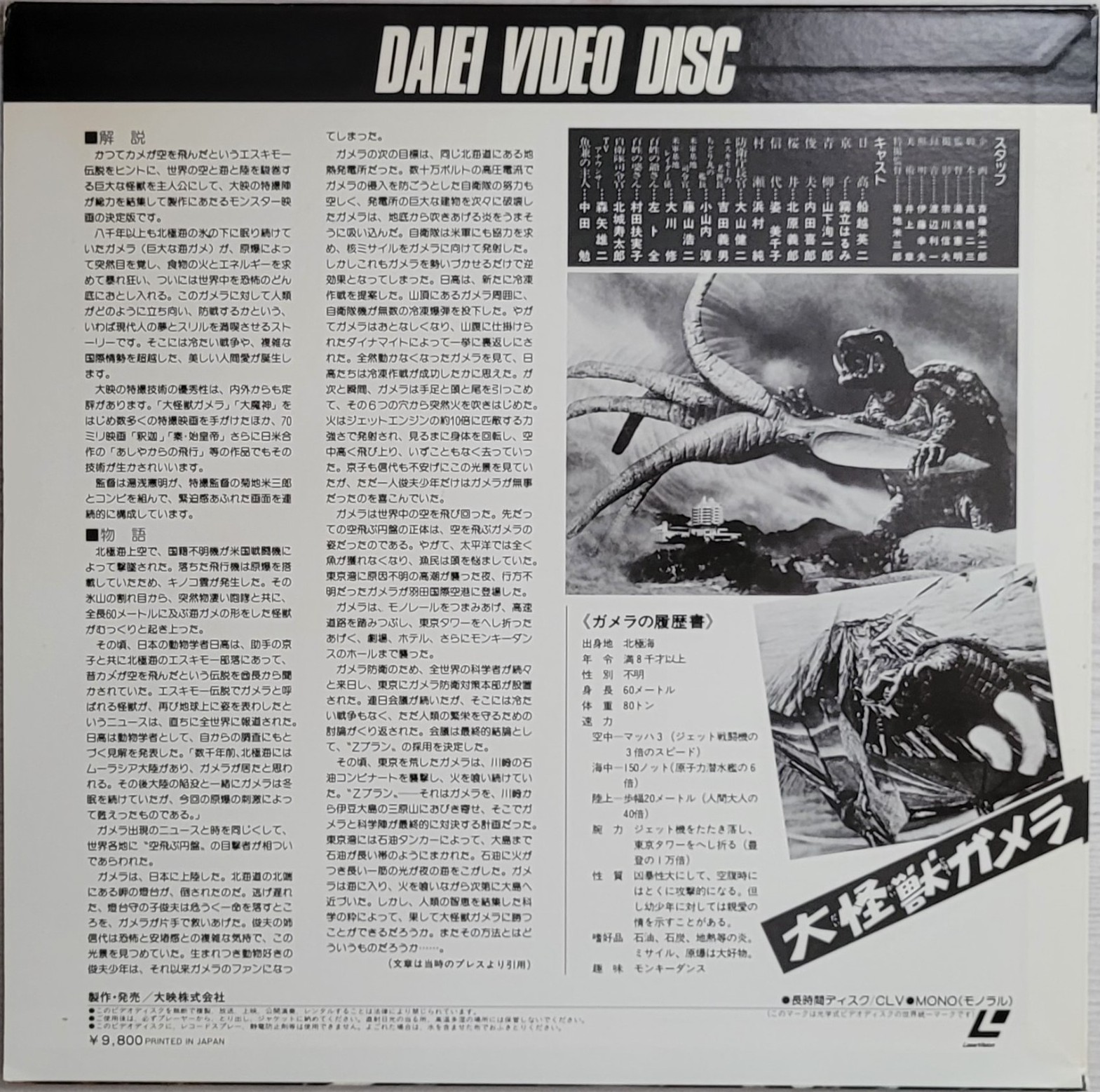 Daiei Video Disc Gamera the Giant Monster LaserDisc back cover