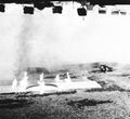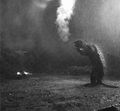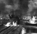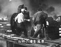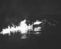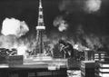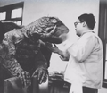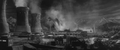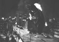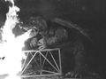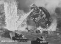 Gamera amidst fire and smoke from the destruction of the power plant (originally filmed for a scene after the destruction of Tokyo by Gamera)