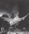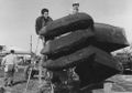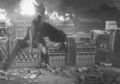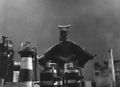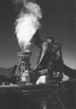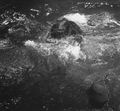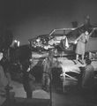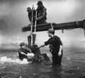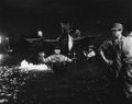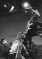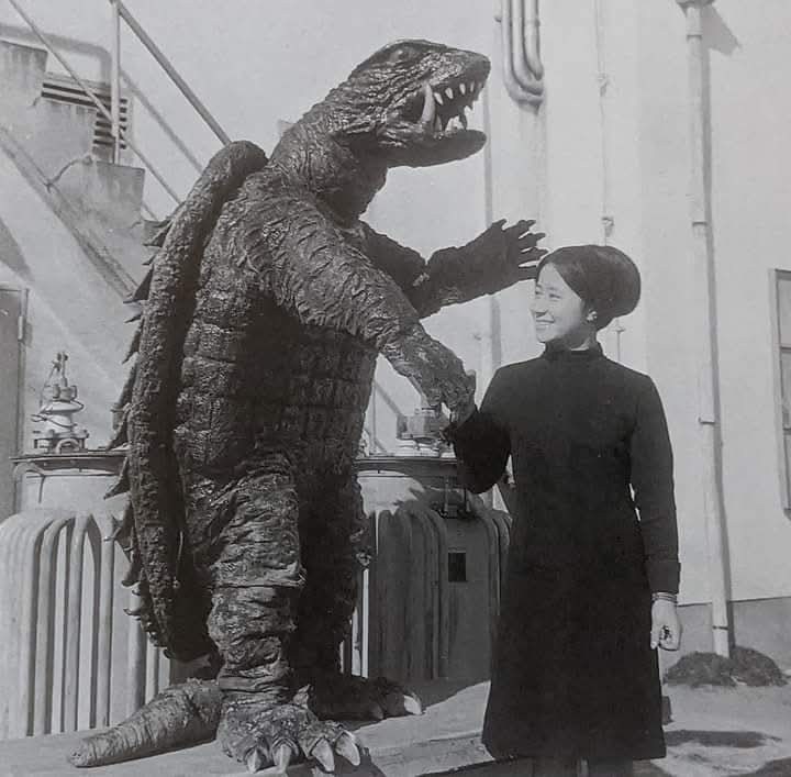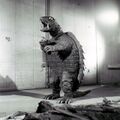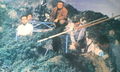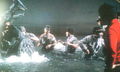 Teruo Aragaki being helped into the Gamera suit during filming of a water scene