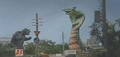 After some time passes, Gamera recovers from having his energy drained, and confronts Garasharp again, this time in the suburbs of Tokyo. During their second fight, Garasharp swallowed a few explosives. Gamera used his fire on Garasharp, but again the cobra absorbed it into her mouth. The fire, however, agitated the explosives inside Garasharp's throat and as a result, she was brutally decapitated by the explosion. When two of Garasharp's offspring emerged from her body, the JSDF moved in to exterminate the small monsters. However, Gamera intervened. Landing near the baby monsters, Gamera allowed them to slither onto his back. Flying away so that the military could not harm the tiny Garasharp serpents, Gamera took them to a deserted tropical island, and proceeded to break off their horns and fangs, leaving the monsters on their new home where they would not cause any further harm to humanity.