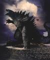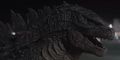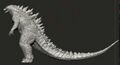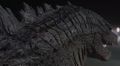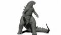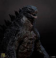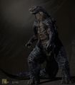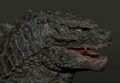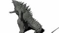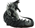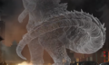For Godzilla's return to the big screen after a 10-year hiatus, the King of the Monsters was revamped and given a new design that didn't look radically different from Toho's established Godzilla designs like the TriStar Godzilla design from the 1998 film. The GareGoji design is completely computer generated and no practical effects whatsoever were used to portray it. Many aspects of the GareGoji's design have an overall highly angular and spiky appearance to them. The face is boxy with tiny, yellow, eagle-like eyes in sunken sockets and has a broad muzzle with thin, spread-out, reptilian nostrils as opposed to more mammalian, clustered looking nostrils of Toho's designs. The mouth is lipless, like a crocodile, and has numerous small, unevenly spaced, needle-like teeth. While this design has no true ears, it does have a pair of small scutes in the same general location that ears would be, that can give the impression of them when viewed from frontward angles. These pseudo-ears are the first in a series of small spikes running down the sides of the neck. Similar bumpy spikes can be found on the sides of the edges of the lower jaw, the shoulder area, and sides of the beginning of the thighs. The neck is also short and extremely muscular and each side has several leafy-looking gills and its underside is partially covered with a series of overlapping, spiky, dewlap-like plates. This design has long, muscular arms and large, partially webbed, alligator-like hands with small, black claws. The GareGoji design has long, pillar-like legs attached to enormous thighs and hips and stumpy, elephant or sauropod-like feet with dull claws. This design also has wide shoulders and a barrel-shaped torso with a pair of large scale patterns on the chest. The dorsal plates are somewhat flat and of moderate size and have a mildly jagged, slightly chipped-away appearance to them, and bear a partial resemblance to the ones found on the MireGoji suit. The tail is long and more whip-like, with a much thinner tip compared with previous designs, and the tail segments are thinner and more angular. The skin texture is much more reptilian and lifelike than the keloid scar or tree-bark like texture found on many of the Toho designs and appears to have many visual similarities with crocodilians and sea turtles. This design is uniformly colored, including the plates, a dull greyish-brown or green.
