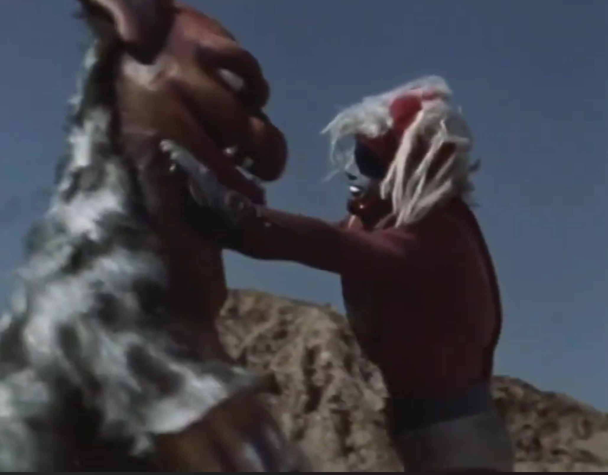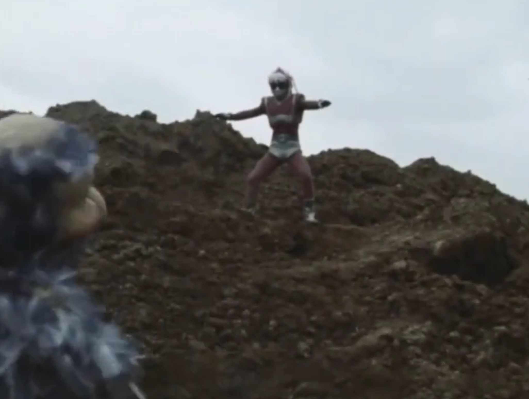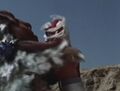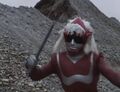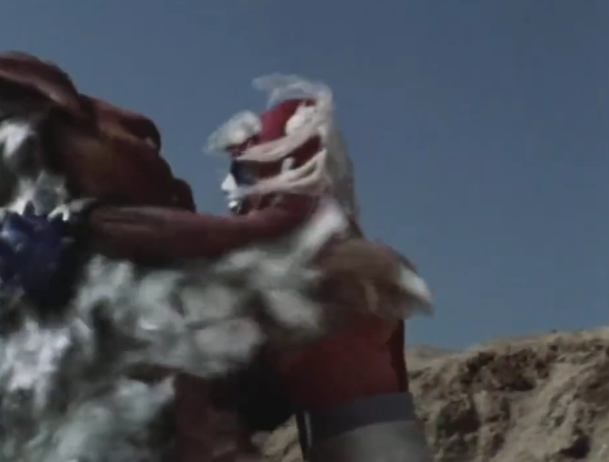 A group of children run alongside Monster Uncle after Wolflar suddenly appears, forcing them to call Godman. The fight begins with Wolflar holding a clear advantage, knocking Godman down several times with little effort. Godman rallies and summoned his God-Crush, but it proves ineffective. He then attempts to strangle Wolflar with the God-Crush, but Wolflar manages to break free, prompting Godman to put the weapon away. During their ongoing struggle, both combatants fall off a cliff, awakening Gejilba, who begins fiercely attacking them, turning the conflict into a three-way battle. After much effort, Godman knocks down both monsters, who turn on each other. Gejilba ultimately tears off Wolflar's tail, releasing a gaseous blood that causes Wolflar to explode. Godman then faces Gejilba alone, injuring his nose and launching his God-Sparks, though the kaiju dodges them. Godman again summons his God-Crush to attempt to strangle his enemy, but ultimately finishes Gejilba off with his God-Kick instead.