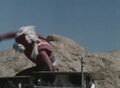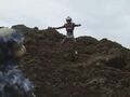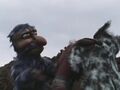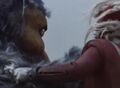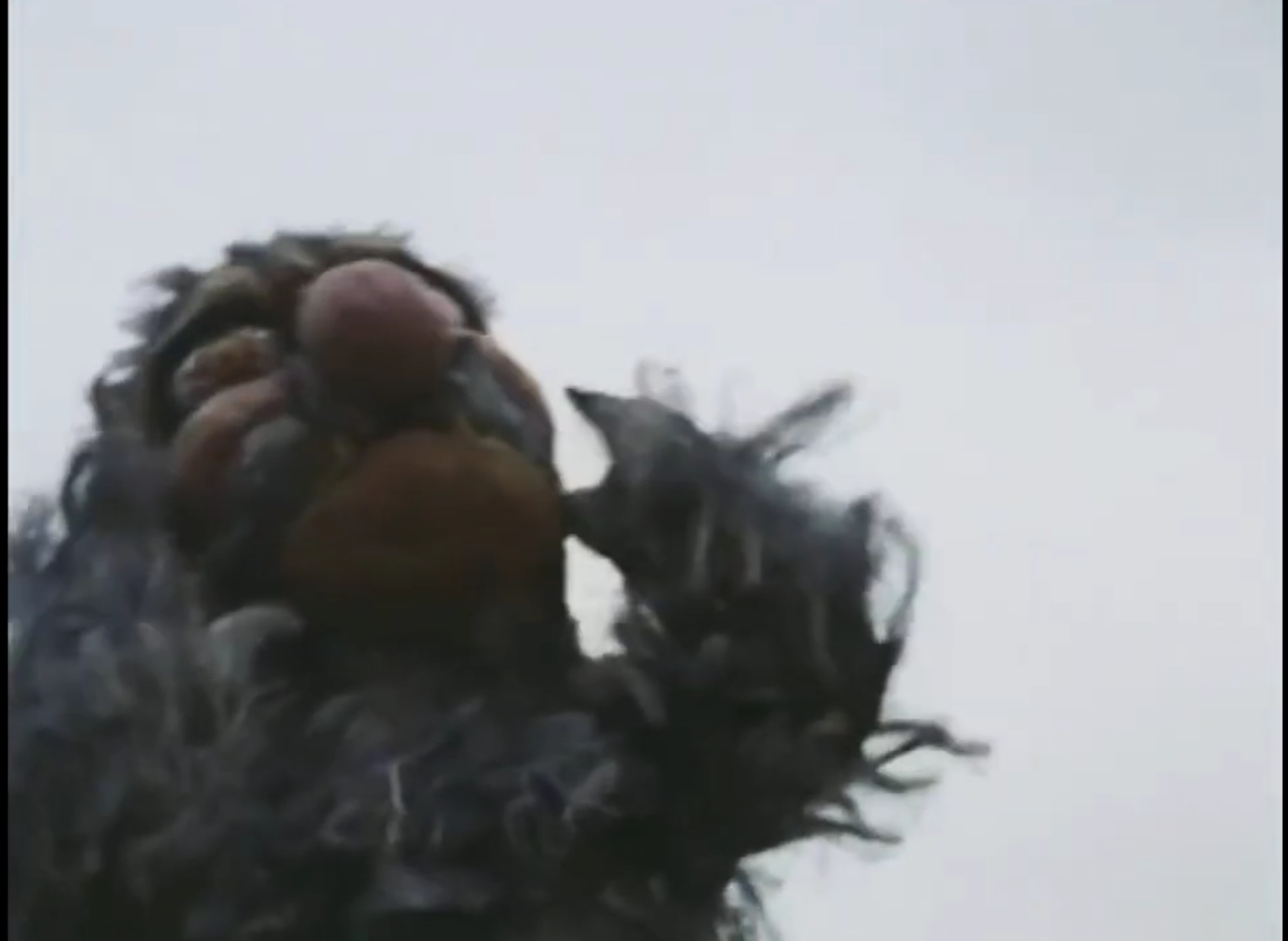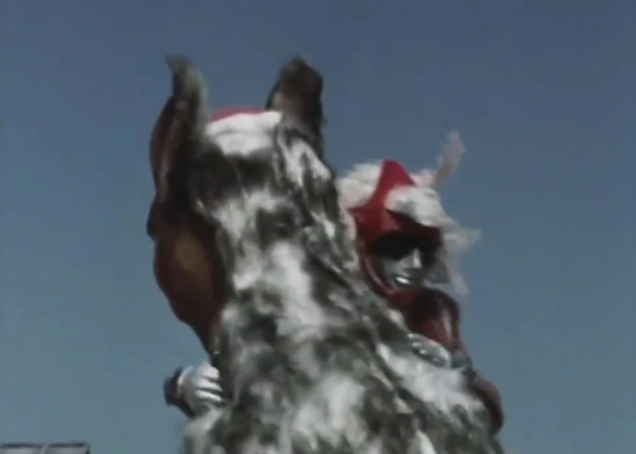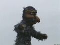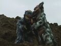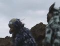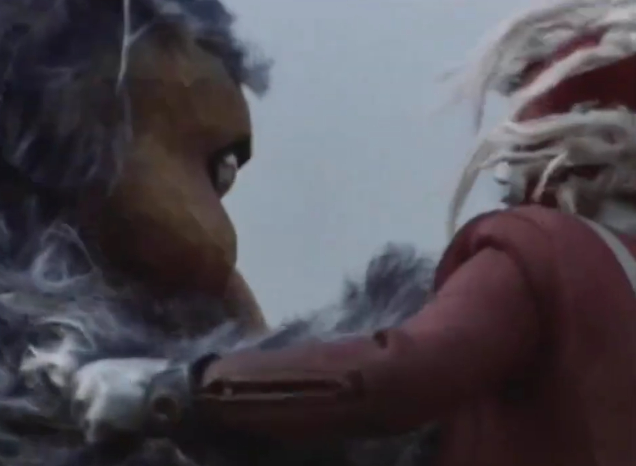A group of children run alongside Monster Uncle after Wolflar suddenly appears, forcing them to call Godman. The fight begins with Wolflar holding a clear advantage, knocking Godman down several times with little effort. Godman rallies and summoned his God-Crush, but it proves ineffective. He then attempts to strangle Wolflar with the God-Crush, but Wolflar manages to break free, prompting Godman to put the weapon away. During their ongoing struggle, both combatants fall off a cliff, awakening Gejilba, who begins fiercely attacking them, turning the conflict into a three-way battle. After much effort, Godman knocks down both monsters, who turn on each other. Gejilba ultimately tears off Wolflar's tail, releasing a gaseous blood that causes Wolflar to explode. Godman then faces Gejilba alone, injuring his nose and launching his God-Sparks, though the kaiju dodges them. Godman again summons his God-Crush to attempt to strangle his enemy, but ultimately finishes Gejilba off with his God-Kick instead.