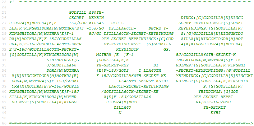 - In the site's source code, a secret message was hidden. It included the secret codes, G, K, M, and E, along with the words "GODZILLA60TH-SECRET-KEYBINDINGS:" repeated several times in the shape of Godzilla's Japanese name, ゴジラ.