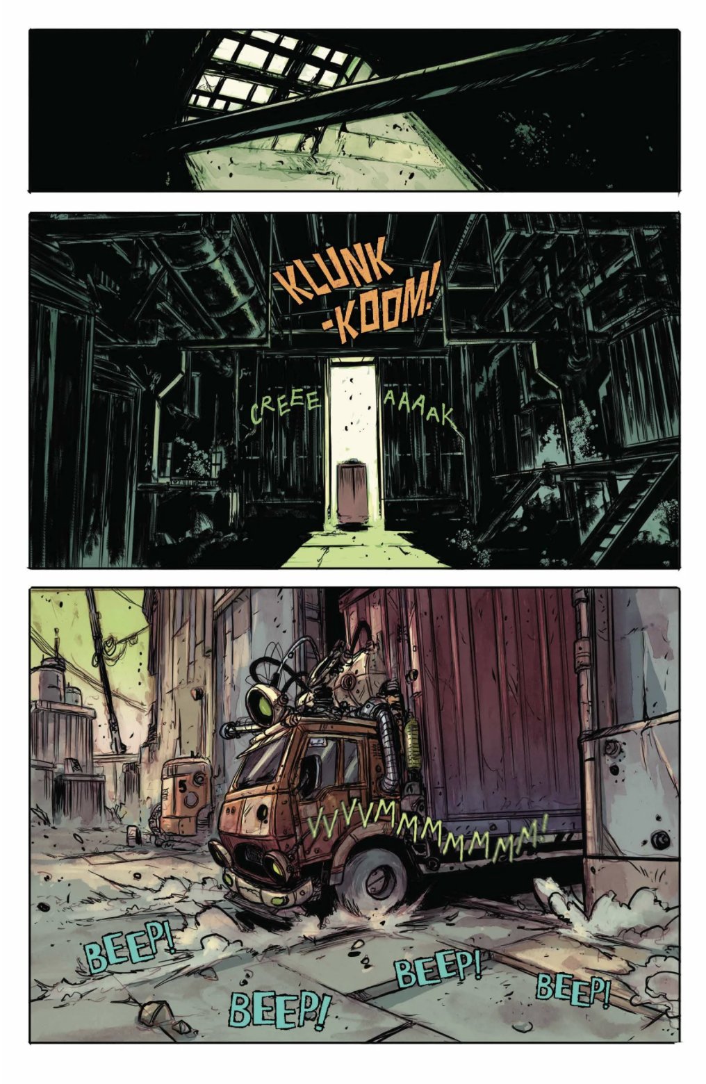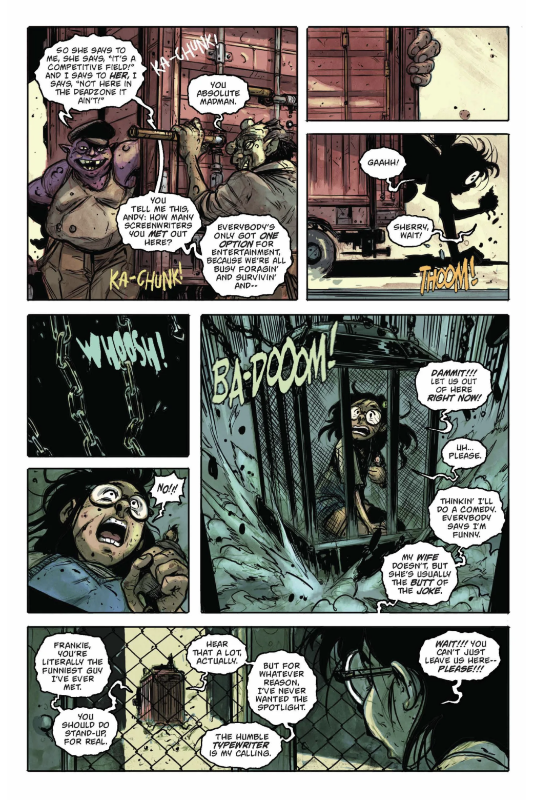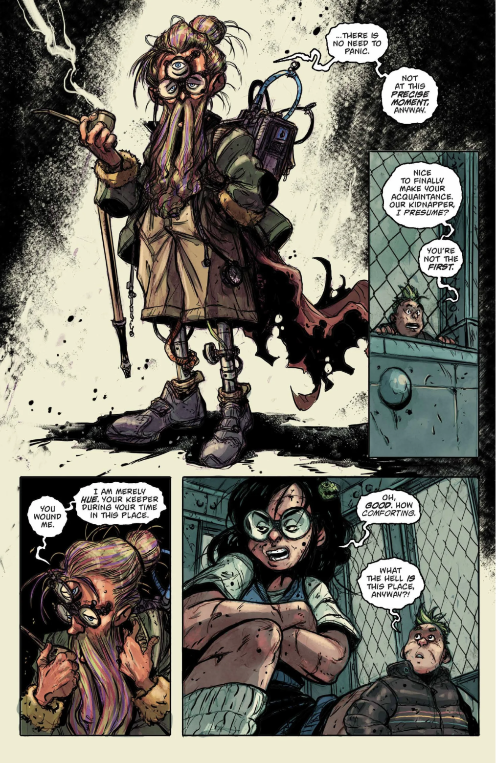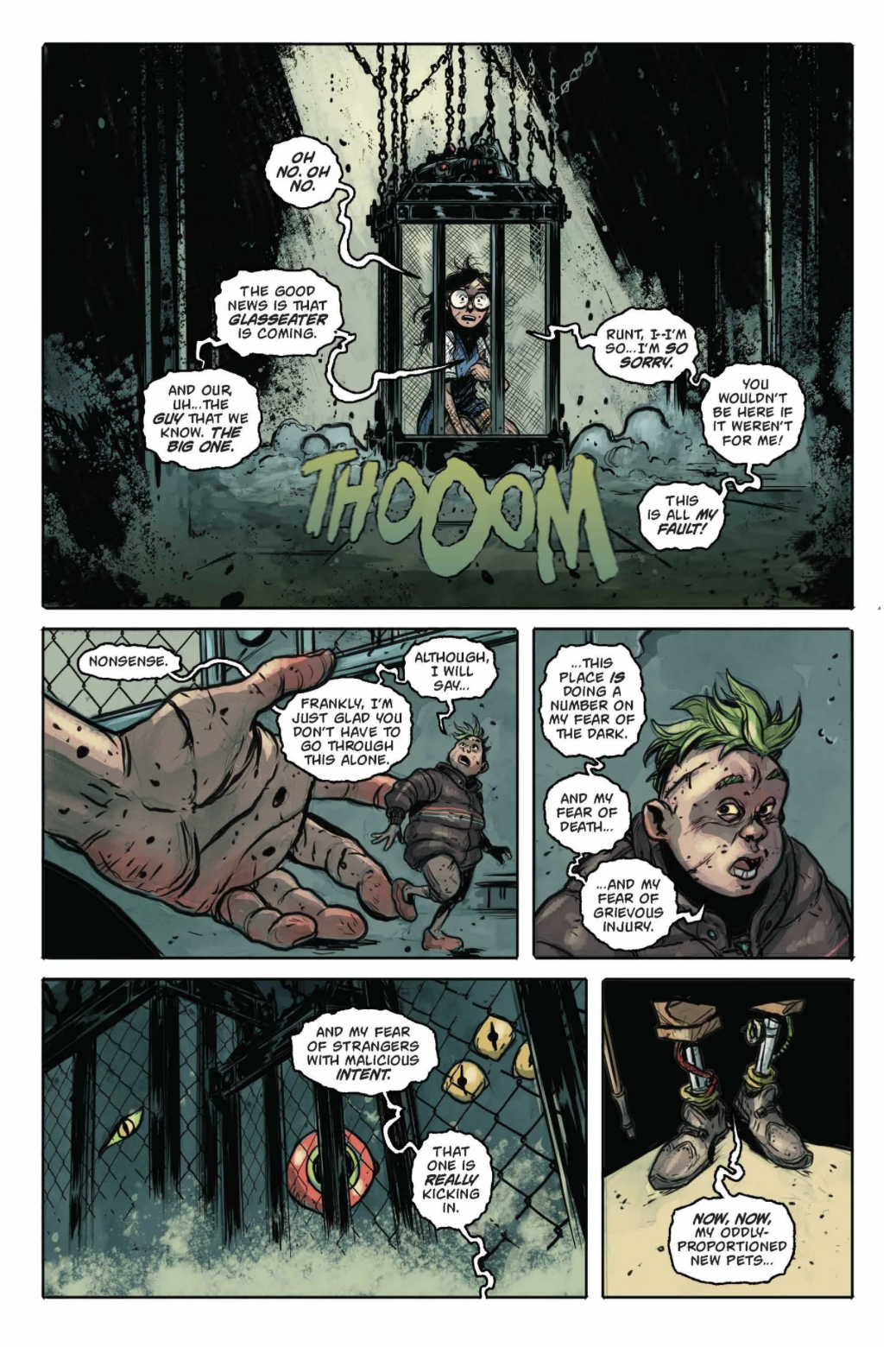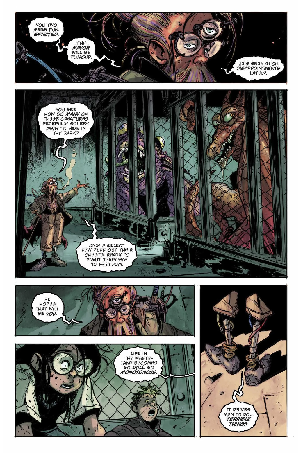 A huge truck staffed by gossiping mutants unloads Sherry Dottsman and Runt into a warehouse, where they are immediately trapped in a cage. They ignore Sherry as she pleads to be freed. Runt reassures her that Glasseater and the Wanderer will be coming to rescue them. They become aware of monstrous forms around them as Hue, their three-eyed keeper, introduces himself. He remarks that they seem more spirited than the other captive monsters, which should please the Mayor, and muses that the monotony of the Deadzone inspires terrible deeds. Meanwhile, the Wanderer and Glasseater surveil the town from the surrounding forest as she tries to convince him to part ways with Sherry at their earliest convenience, so as to better develop their dynamic as a trio. Emerging into the light, they are surprised to find themselves on an ordinary-looking suburban street, complete with ice cream truck. Onlookers quickly gather, and one, spotting the Wanderer's tail, rushes for a phone. He drags Glasseater away from a pair of kids once she seems ready to pick a fight, remarking that he has a bad feeling about the town.