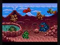 The second page is a beach area that features LittleGodzilla, Manda, Baragon, Battra, Ebirah, and the Giant Octopus. Godzilla, Baragon, Manda, and LittleGodzilla stand on the shore, while Ebirah and the Giant Octopus remain in the water, along with two battleships. Battra flies above the water, near a large rock shaped like Moguera's head. LittleGodzilla will constantly build a sand castle on the beach. Interacting with Baragon causes him to burrow underground and dig a hole underneath Godzilla, which he will fall into. Godzilla then jumps out of the hole, and all of the other kaiju laugh at him. Clicking on Manda simply causes him to roar (though he mistakenly uses Rodan's roar). Clicking on Battra will cause him to fly up to a cloud and fire his prism beams at it, revealing an Xilien UFO which promptly flies away. Clicking on one of the battleships will cause it to fire a cannonball at Godzilla, which comically burns him, causing the other kaiju to laugh. Clicking the other battleship causes it to fire a cannonball at a coconut tree on a nearby cliff, causing a coconut to fall on the Giant Octopus, who angrily spits ink at Godzilla. Clicking on the Giant Octopus will initiate a minigame. In this game, the player must click on one of the Giant Octopus' tentacles based on onscreen instructions. After successfully doing this several times, the game will be complete. Clicking on Ebirah's exposed claw will initiate a minigame, which is a Simon Says-type challenge. Ebirah will emerge from five whirlpools in a random order, which the player must memorize and repeat by clicking on the whirlpool. This game will get progressively harder and more complex, and will eventually be complete after several successful trials. Sometimes, clicking on Battra will initiate another minigame. In this minigame, one or more clouds will appear in the sky, and the player will have to click on a number that appears on the bottom of the screen based on onscreen instructions. Sometimes, this number will correspond to one of the clouds, or the number of clouds that there are.