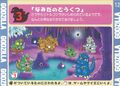 The third page is set in an underground cavern, where King Ghidorah, Gigan, Megalon, Mechagodzilla, and SpaceGodzilla are bullying LittleGodzilla, causing him to cry. Clicking on LittleGodzilla will cause Godzilla to approach him and try to comfort him, but to no avail. Clicking on any of the kaiju will cause them to hurt LittleGodzilla in some way, making him cry even more. Clicking on Gigan causes him to throw a rock at LittleGodzilla, clicking on Megalon causes him to spit a napalm bomb at a stalactite, which falls on LittleGodzilla, clicking on Mechagodzilla causes him to fire his plasma grenade at LittleGodzilla, and clicking on King Ghidorah causes him to kick rocks onto LittleGodzilla and laugh. Clicking on SpaceGodzilla only causes him to roar. There is a rock floating in a small pond, which if clicked on will initiate a minigame. In this minigame, Godzilla must jump across two moving rock platforms floating in the water to reach LittleGodzilla on the other side. After this minigame is complete, two other minigames may be initiated. The first involves King Ghidorah. In this game, King Ghidorah will spit a ball of electricity at Godzilla, who must avoid it. After a period of time, King Ghidorah will spit another ball, and then another. After Godzilla avoids all three for a certain period of time, the game will be complete. The other minigame begins with all of the kaiju on the stage besides Godzilla racing, and LittleGodzilla losing. LittleGodzilla will begin to cry, while the other kaiju surround him and laugh. The screen then shifts to a maze, where the player is given the ability to place all of the kaiju besides Godzilla at different starting points. Once the kaiju are placed, Godzilla will roar and the kaiju will race to the finish point. The goal of this game is to place the kaiju in such a way that LittleGodzilla will finish in first place. After the player successfully does this, the screen will return to the cavern, where LittleGodzilla is no longer crying but standing happily.