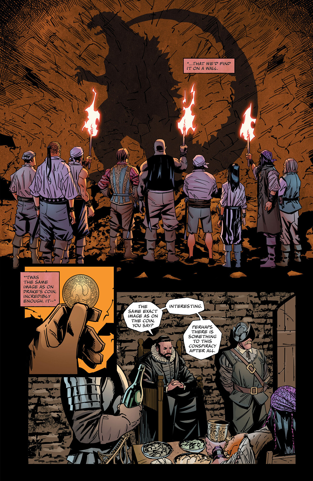 AVAST, MATEYS! As One-Eyed Henry Hull continues his bizarre tale, Sir Francis Drake and his men find themselves surrounded by monsters, both human and kaiju! While the crew of the Golden Hind have taken terrible losses from giant bats and colossal sea turtles, they’ve yet to face the REAL dragon. But they might not need to worry about Godzilla if Ebirah slays the King of Monster Island—or Drake and his crew—first!