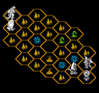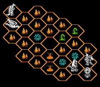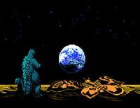 Each world takes place on a grid, with hexagonal spaces serving as stages. Godzilla can move two spaces per turn, while Mothra can move four (in the Japanese version, Godzilla can only move one space, while Mothra can move two). After the monster moves through those spaces, it will enter the game's sidescrolling action sections, where it has to fight through waves of enemy tanks, spaceships, etc. To move to the next world, the remaining monster(s) must move onto the Base Headquarters stage. On the following turn, the player must select the monster without moving and the game gives the option to advance to the next world. If either Godzilla or Mothra died before advancing, the deceased monster will reappear in the next world; however, the revived monster will lose one level as a result. Things to note: if Godzilla or Mothra advances to the next level, and the other monster left behind is destroyed, the game will be lost. In addition, there is a chance that while exploring the levels, the player can encounter a 'Hyperspace' area. These areas feature battles against the Gohten from The War in Space, Dogora cells, or Matango. Clearing these areas can reward the player with another level.