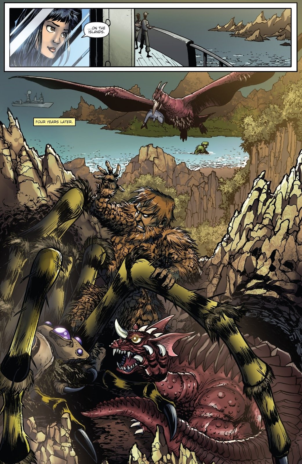 During a roller skating competition, in which Lucy Casprell wins under the name "Kaiju Cutie", the building is crumbled from above as the audience leaves in a panic. Lucy wonders going on as a bystander tells her that "he's back". She asks who's back, only to have her answer in the form of Godzilla, who proceeds to demolish the city and destroy several tanks firing at him. Lucy tries to escape, but the King of Monsters chases her down and blasts her with his atomic breath. Suddenly, Lucy jolts awake in her bedroom as it's revealed that the attack was only a nightmare. She checks what time it is and laments that the "mid-watches are killing her". Working all night until the sun rises, trying to sleep, and hoping everything stays calm on the Monster Islands. It's revealed that four years have passed since Godzilla's disappearance after he was buried underwater with the Devonian civilization, and the Monster Islands are now filled with various kaiju. As Lucy looks out the window of her room on a patrolling CKR ship, Rodan is seen with a whale in his beak, Gaira is swimming in the nearby bay, and Kumonga is tussling with Sanda and Baragon. Lucy meets up Chavez in the Monster Islands HQ as the soldier asks why she's here so early. Lucy tells him about the dream she had with Godzilla at the roller derby, saying that he was "scary as hell" in it. Chavez jokes that Lucy always thought Godzilla was cute before bringing her topside to see Zilla swimming near the islands. He reveals that they picked him up that morning and they tracked him to where he was at that moment, stating that this was the closest he's been to the islands. Lucy asks why he hasn't made set foot on the islands yet, with Chavez replying that maybe he wasn't welcome. Lucy retorts that maybe Zilla will be welcome in time before the soldier states that they'll get a boat and drone to survey him as Lucy turns her attention to Kristina Sumres and Jason Ford, who are checking on one of their cameras. Chavez tells her not to be "so obvious", with Lucy stating that she's just worried and that there are hazards to this job. Chavez suggests pranking them with Godzilla's roar and Lucy jokingly chastises him, stating that Gaira will go nuts if he hears that. Chavez jokes that "she's no fun" and tells her that it's lunch time, "or breakfast time for her".