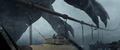 Soldiers are shown running through streets and a flooded city. Cranston's character takes off his radiation suit; Olsen is shown crying. The military is then shown with paratroopers and soldiers loading missiles. The shot continues, revealing a massive, skinny, four-legged monster. It seemed to have smaller arms on its chest and looked as if it had wings as well.