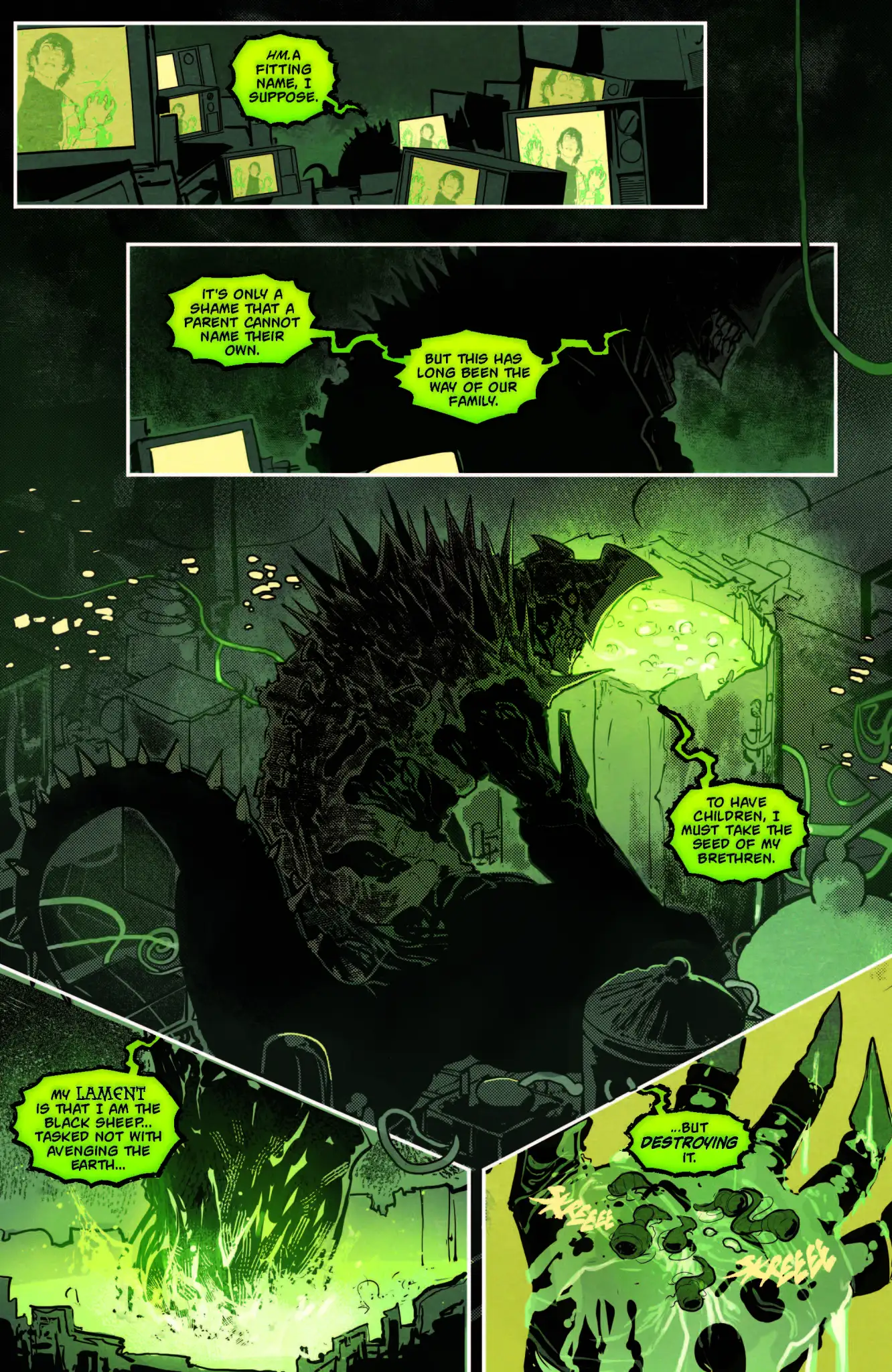 A mysterious kaiju watches the battle from their monitors. They deem the name "Yacumama" fitting, even if they wish they could have named their offspring themself. They describe themselves as a black sheep among kaiju, bent on destroying the Earth rather than avenging it. They reach into a tower full of bubbling green liquid and grab a handful of smaller Yacumama. As G-Force headquarters panics over their supposed asset's transformation into a full-fledged kaiju, Petithomme contacts his superiors, who ask if Braid poses an "evolutionary threat" to them. More sympathetic to Braid after their last meeting, he responds that the boy and Godzilla may be traps for each other. As Yacumama reaches the deck of the cargo ship, which is now in flames, Godzilla stalks it from underwater, fighting off smaller roundworms.