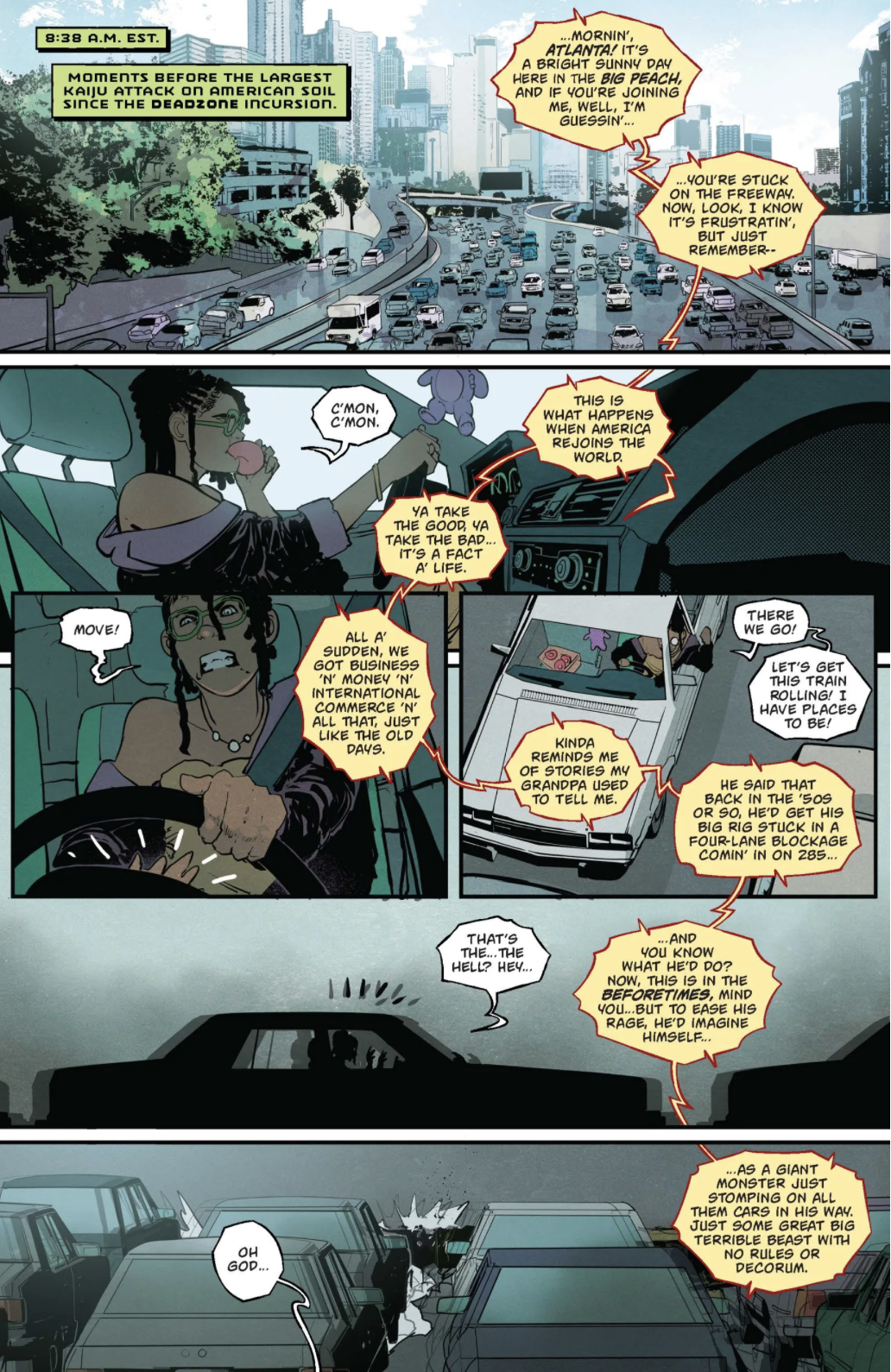Gridlock on the Atlanta is interrupted by Godzilla, who smashes through a highway. Five hours earlier, G-Force and Captain Carroñero's pirates continue their fight against Yacumama. Dr. Rumi Chiba orders Jacen Braid not to use his powers against the kaiju; as he wonders what to do instead, Nuki and Carroñero come to his defense. Nuki, still upset at Braid's closeness with Chiba, brutally dispatches every roundworm near her while recounting how she never saw any kaiju during her time on the Deadzone border, just diseased, starving people. Commander Riviera laments that every roundworm they kill is one less weapon to use against Godzilla, while Chiba reminds him that they need to survive this battle first if they want a shot at Godzilla. Slicing apart a roundworm with her sword, Rumi observes that Yacumama seem to instinctually fuse together to conserve energy. Incense unleashes a fire blast to incinerate the largest Yacumama, then poses for a selfie with Nuki, failing to notice a smaller creature charging at them from behind. Braid punches it into the sea, while Riviera restrains Carroñero.