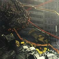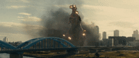 Godzilla collapsing from buildings falling on top of him