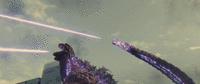 Shin Godzilla's atomic energy can also be redirected and fired from the tip of his tail. This beam is apparently fired from a mouth on the vestigial "spare head" at the end of Godzilla's tail. Unlike the dorsal fin beams, the tail beam can be fired at the same time as Godzilla's atomic breath, allowing him to strike multiple targets at once.