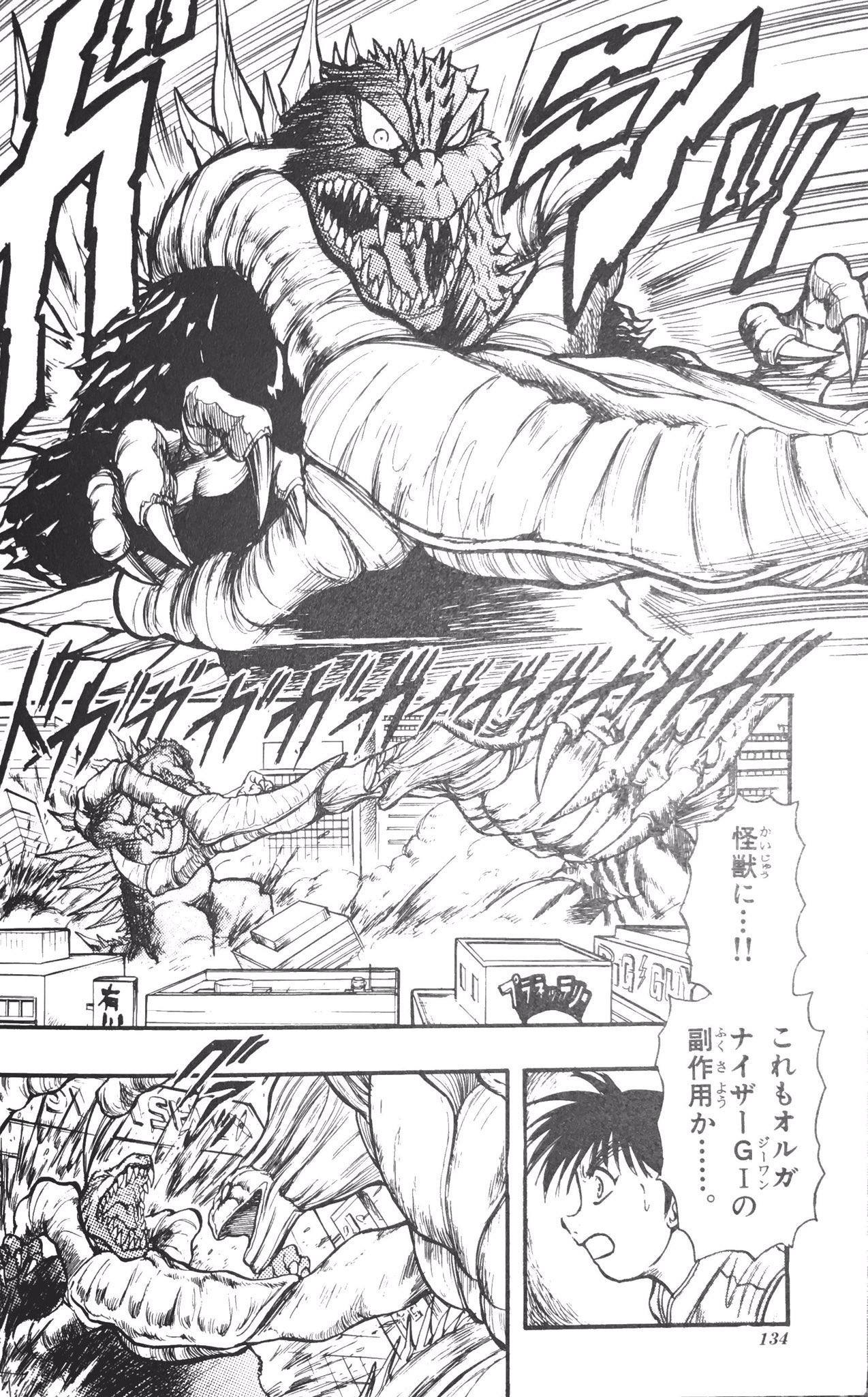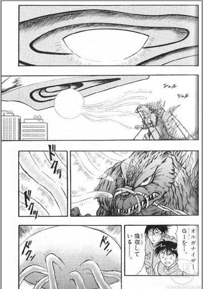 - Orga's mutation is uncontrollable and the beast continues to grow throughout his battle with Godzilla. Orga eventually becomes a huge mass somewhat resembling Biollante who dwarfs Godzilla, and actively swallows Godzilla rather than allow Godzilla to charge into his maw as in the film.