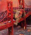 After sunning himself on, and consequently doing great damage to, San Francisco's Golden Gate Bridge, Godzilla tearfully departs back home to Japan, having loved his visit to the United States.