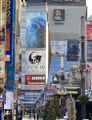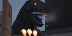 The Godzilla Head (ゴジラヘッド Gojira Heddo) is a giant statue of the head of Godzilla mounted on the 8th floor terrace of the Hotel Gracery Shinjuku in Tokyo, Japan since 2015. The full building, called the Shinjuku Toho Building, also contains a Toho Cinemas theater, where the red carpet premiere for Shin Godzilla and the blue carpet Japanese premiere of Godzilla: King of the Monsters were held. The head is based on the head of the BatoGoji Godzilla suit,[1] and is capable of spewing mist and having its eyes illuminate. It is located 50 meters above the ground, making it a life-size representation of Godzilla's height in the Showa era. The faux rubble beneath the head contains relief depictions of scenes from the original Godzilla, The Return of Godzilla, and Godzilla vs. Mothra. It has become an iconic fixture of the Shinjuku cityscape, appearing in numerous films, series, and video games, including those in the Godzilla franchise itself.