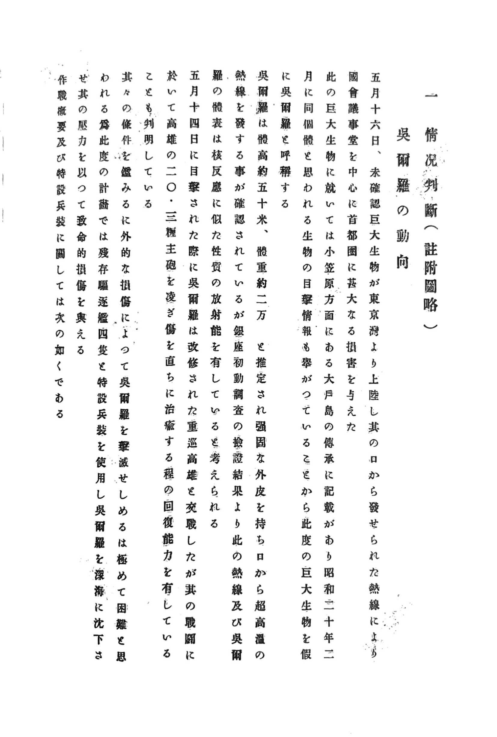 - According to the "Special Disaster Response Materials Compilation" booklet that came with the Godzilla Minus One Blu-ray Deluxe Japan Collector's Edition set, Godzilla destroyed the Takao on May 14 and decimated Ginza on May 16.[182]