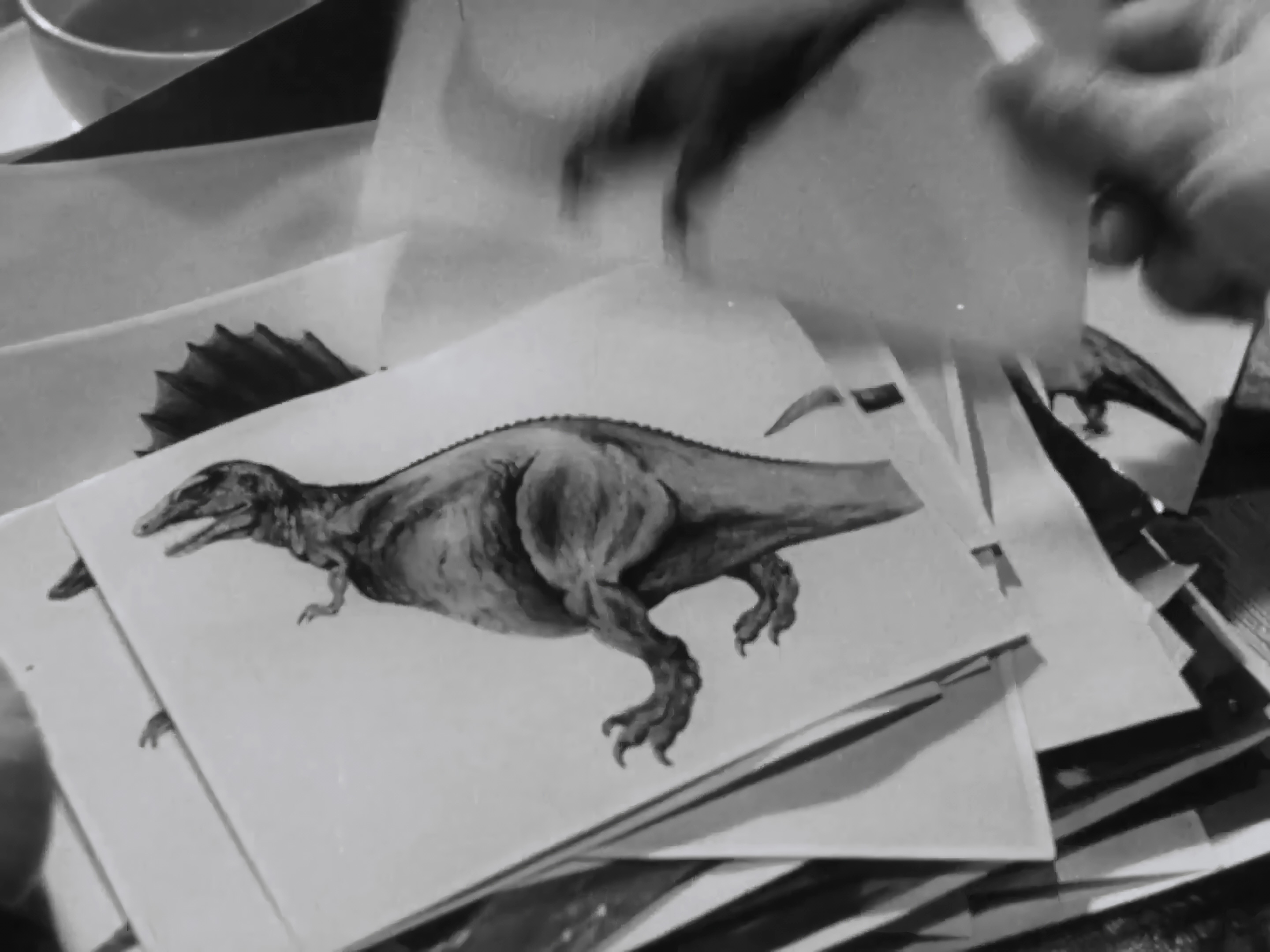 A theropod on a card that Tsukioka is looking at