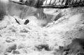 The monsters fighting underwater, causing a spout of bubbling foam