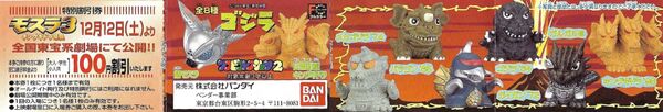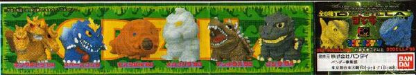 Godzilla Sofubi Collection is a line of 16 1-inch super-deformed vinyl figures made by Bandai and released only in Japan in mid- through late 1998. The first set was released around the time the American Godzilla film was released in Japan, and the second set was released in conjuction with Rebirth of Mothra 3. Each figure cost 100 yen and came in capsules.