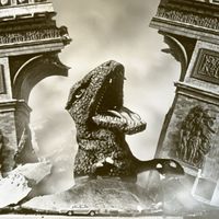The final screenplay for the film actually had the walrus-like kaiju Maguma from Gorath as the creature that attacks Paris.[24] At some point during the film's production, the monster was dropped in favor of Baragon. Baragon's suit had actually been returned to Toho after being modified by Tsuburaya Productions in 1966 and 1967 for Ultraman and Ultraseven, and was restored for use in Destroy All Monsters.[25] According to several sources, the real reason Baragon was replaced by Gorosaurus for the Paris attack scene was due to concerns that the Baragon suit's ears would interfere with the sequence depicting the monster emerging from underneath the Arc De Triomphe.[25][26] This change was not a last-second alteration as often believed, as storyboards created for the film depict Gorosaurus attacking Paris and preliminary set designs done by Yasuyuki Inoue list Gorosaurus as appearing in the scene.[27]