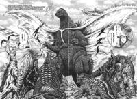 - ↑ It is the second Godzilla to appear in 50 years, after the first generation Godzilla which reduced Tokyo to scorched earth in 1954 (Showa 29). It is larger in size than the first generation. / 1954(昭和29)年に東京を焦土と化した初代ゴジラ以来、50年ぶりに出現した第2のゴジラ。初代よりひとまわり大きい