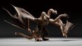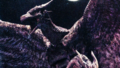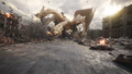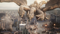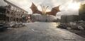 Two armored vehicles depart from the theater. Ghidorah's Gravity Beams strike a building near the lead vehicle, crushing it with rubble. The second vehicle evades a flying train car and uses the rubble of a just-collapsed building as a ramp. Ghidorah lands in front of it, but it drives between his legs. He gives chase, trying and failing to bite it with all three of his heads. Finally he flies ahead of it, lands, and charges forward at full speed. The vehicle reverses and hides in the shell of a building, but he soon finds it and snatches it up in the jaws of his center head. As he takes to the skies, Rodan arrives and attacks head-on. Ghidorah repulses him, but drops the vehicle. It deploys its parachutes as the monsters clash. Ghidorah prevails easily, throwing Rodan to the ground before assailing him with Gravity Beams. He blasts the top off of Tokyo Tower, which the vehicle narrowly avoids, as Godzilla arrives in the city and roars a challenge. The vehicle lands on Godzilla's side and climbs up his shoulder before driving down his tail, soaring into the air once more, and landing on a roof.