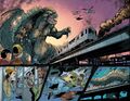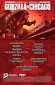 • Although it is the third-most populous city in the United States, Godzilla only visited Chicago twice in official media prior to this issue, likely due to its great distance from any ocean. Those visits took place in the picture book Godzilla Discovers America and episode 30 of Godzilla: The Series, "Metamorphosis". Series composer Michiru Oshima also wrote the piece "Godzilla vs. Chicago" for the Kaiju Crescendo concert held in 2019 at the North Shore Center for the Performing Arts in Skokie, Illinois.