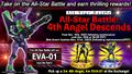 In November 2022, Godzilla Battle Line added some elements from the Evangelion franchise for shopping and Evangelion Unit-01 and the Fourth Angel as new playable characters, making this their first appearance in a Godzilla game. On February 28, 2023, the second part of the collaboration started, adding new and old elements for shopping and Evangelion Unit-00 and Evangelion Unit-02 as new playable characters. Evangelion Unit-08β and the Tenth Angel were added on March 17. The collaboration ended on December 26, 2023, with players unable to obtain new Battle Pieces for these units without the use of Upgrade G-materials. Voice lines associated with the units were also removed.[2]