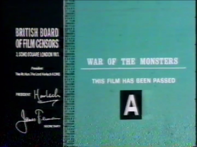Following the success of Monsters from an Unknown Planet, Miracle Films released Godzilla vs. Gigan theatrically in May 1977 as War of the Monsters.[9] It received an A (Advisory) certification by the British Board of Film Censors (BBFC) on February 21, 1977 and was uncut.[10][11][12] The film was double billed with the spaghetti Western Twilight Avengers (1970). War of the Monsters was shown on the ITV regional channel ATV on May 17, 1980. This version of the film was released on VHS by Derann Film Services in May 1981, then again by Stablecane, under Video Masterpiece, in June 1986;[13] the 1986 release was rated PG by the BBFC.[11] The film was shown under its original title on Channel 4 on July 6, 1990,[14][15] as part of the channel's summer "Creature Features" season; it was later broadcasted again on February 8, 1997.[16] Godzilla vs. Gigan was later released on VHS by PolyGram Video in 1992 (in a double feature with Godzilla vs. Megalon) and by itself in 1998 by 4 Front Video; both releases were again rated PG. Sony released the Japanese version of the film on Blu-ray in 2019 as part of The Criterion Collection's Godzilla: The Showa-Era Films, 1954–1975 box set. Derby QUAD screened Godzilla vs. Gigan, as part of their Godzilla-A-Go-Go 2 event, on January 18, 2025.[17] The film retains a PG rating for "mild fantasy violence, bloody images, language".[18]