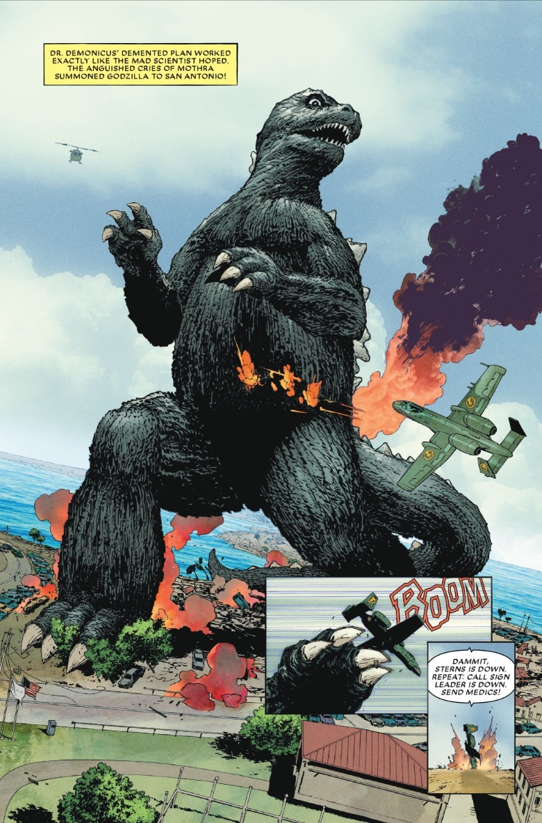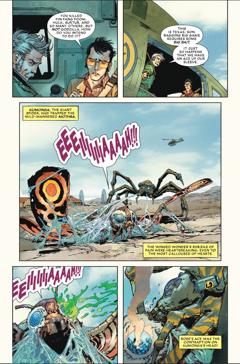 Giles notes that while the Thunderbolts have killed countless monsters, Godzilla continues to allude them. Ross invites him to witness their plan in action: Kumonga, controlled by Demonicus, is assaulting a webbed-up Mothra, a known comrade of Godzilla's. Banner finds the scheme cruel; Demonicus scoffs at his "weakness." He ironically adds that his body has been destroyed by their war against the kaiju, and Banner is lucky not to know what it's like to be a monster. As Demonicus predicted, Godzilla makes landfall in San Antonio, quickly downing an A-10 Thunderbolt piloted by Samuel Sterns. Ross parachutes from the helicopter into a hanger, where he hastily enters a cockpit. Banner does the same. They both launch Mechagodzilla units towards the King of the Monsters, which Demonicus notes were designed by Tony Stark before Godzilla killed him. Godzilla quickly torches Banner's Mechagodzilla with atomic breath, damaging its head, while Ross fires two missiles from his Mechagodzilla's mouth to down Godzilla. Demonicus orders Kumonga to join the fight. Before its webs can restrain Godzilla, however, he tips Ross's Mechagodzilla into the spider, then tears off the arm of Banner's Mechagodzilla and beats him with it.