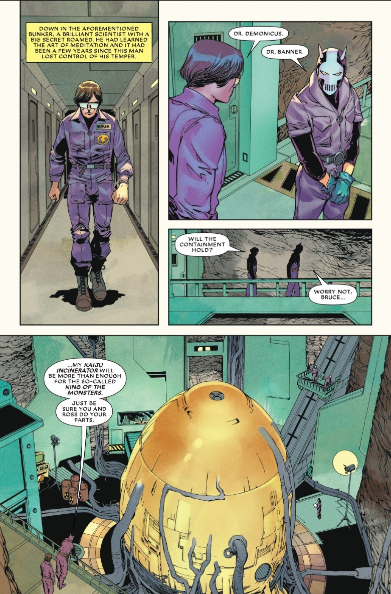U.S. General Thaddeus "Thunderbolt" Ross ends a press conference at Thunderbolt Ranch, whose staff are working to capture Godzilla. Jackson Giles of the Daily Bugle Texas follows Ross into a helicopter, asking him if the Hulk is being confined at the ranch; Ross assures him that the Hulk is dead. Bruce Banner, however, is indeed roaming the halls of Thunderbolt Ranch. He observes Dr. Demonicus's Kaiju Incinerator, which the doctor assures him will be capable of containing Godzilla.