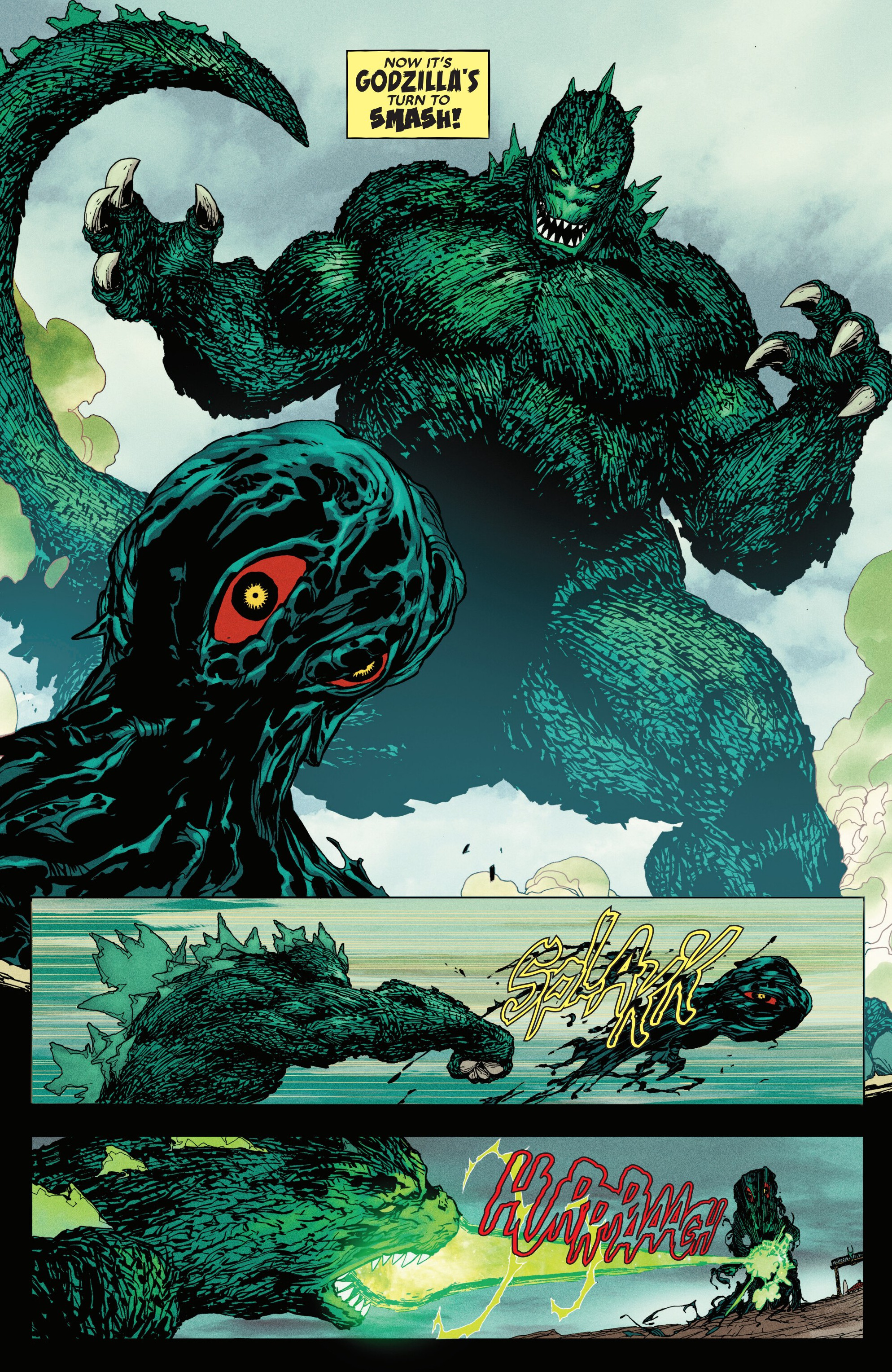 As Godzilla trains his atomic breath on Ross's Mechagodzilla and Kumonga, the general implores Demonicus to deploy the fail-safe he's alluded to. Removing his mask to reveal his warped face, Demonicus announces his intent to destroy both his kaiju enemies and the Thunderbolts. He reveals that he's been using the Kaiju Incinerator to both break down kaiju bodies and create a new life form to dominate the planet: Hedorah. The Smog Monster quickly knocks Godzilla into Mechagodzilla. Fearing the warring kaiju will crush him, Banner transforms into his long-suppressed alter ego, the Hulk. Demonicus is surprised, wondering who the Thunderbolts buried in the Hulk's grave. As Hedorah melts Ross's Mechagodzilla, Hulk saves the blustering general, gloating that he now owes him his life. He adds that the man they buried was Rick Jones, a death arranged by Banner. Meanwhile, Hedorah targets Godzilla's eyes, again felling him and beginning to burn towards his brain. The Hulk throws a punch at the Smog Monster, only for its skin to set his arm ablaze. As Demonicus taunts him, calling him a monster, the Hulk resolves to help Godzilla, driving a power cable into his chest to revive him and spilling his own blood into the wound. Hedorah smacks the Hulk away from Godzilla, only to find itself confronting a towering, gamma-irradiated Godzilla. Godzilla punches Hedorah backwards, then annihilates it with a green blast of atomic breath. The monster's remains spill into Thunderbolt Ranch, killing Demonicus.