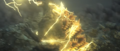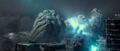 In an underground cavern beneath the ocean, Gigan Rex's maimed corpse laid attached to many wires siphoning bright red energy and transferring it to a space in the wall shrouded in shadow as a Seatopian woman held up a small engraved stone, telling an unseen being to attack the people on the surface as the beasts from the sky had.