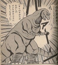 Despite his relatively small size in comparison to other kaiju, the Godzillasaurus that would eventually become Godzilla displayed a high amount of endurance. Small arms fire and even rocket launchers were unable to damage him, with only barrages from several battleships proving strong enough to draw blood and weaken him. In the Kodansha Godzilla, King of the Monsters manga, he endured attacks from an Ankylosaurus and survived being buried by Anguirus long enough to transform back to Godzilla.