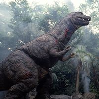 A Godzillasaurus lived on Lagos Island in the Marshall Islands in 1944, many millions of years after the extinction of the dinosaurs. During a battle between a badly outnumbered Japanese garrison and American island-hopping forces during World War II, the Godzillasaurus emerged from the jungle. The shocked American soldiers opened fire on the creature, causing it to violently retaliate by stomping them to death, striking them with its tail, and toppling trees onto them. Upon pursuing the soldiers through the jungle and onto the beach, the Godzillasaurus was bombarded by shells and artillery fire from the nearby naval ships. The dinosaur began to bleed profusely before collapsing from its wounds. Believing it dead, the remaining American soldiers surrounded the fallen dinosaur before it got back to its feet and killed them all. Badly wounded, the Godzillasaurus returned to the jungle while the American military withdrew from Lagos entirely. Days later, the Japanese garrison under the command of Major Yasuaki Shindo paid their respects to the dinosaur for saving their lives as it lay dying. Shindo expressed his regret that they could not bring their savior to safety before saluting it and leading his men to depart the island. Unbeknownst to them, the dinosaur would survive its injuries and go on to be exposed to the blast of the Castle Bravo hydrogen bomb test conducted at nearby Bikini Atoll ten years later, transforming it into Godzilla.