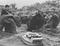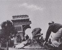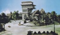 In the final draft of the screenplay for Destroy All Monsters, the walrus-like kaiju Maguma from Gorath attacked Paris and destroyed the Arc de Triomphe.[22] Maguma was eventually replaced by Baragon in the role, but the filmmakers had concerns about using the restored Baragon suit in the scene due to problems with the suit's ears.[23][12] The role was ultimately given to Gorosaurus, who gained Baragon's ability to burrow and was even referred to as "Baragon" and the "Subterranean Monster" in dialogue. The Gorosaurus suit from the previous year's film was reused for the character's role in this film, with minor cosmetic changes made to the suit's coloration. Hiroshi Sekita again wore the suit, while simultaneously alternating with Tadaaki Watanabe in the role of Anguirus. A small puppet of Gorosaurus and all of the film's other Earth kaiju was created for long shots of the monsters in Aokigahara before the film's final battle. Gorosaurus appeared on the poster and in publicity stills for the next year's film All Monsters Attack, but his role consisted only of a very brief appearance utilizing stock footage from King Kong Escapes. The suit was used in 1970 as part of the "Godzilla vs. Gamera" stage show at the World's Fair. Only one photograph of Gorosaurus clashing with Godzilla with Space Gyaos in the background has surfaced.