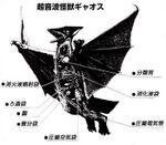 Anatomical illustrations and the books Gamera the Brave Super Complete Works and Friends: Gamera the Brave[18], mention that Original Gyaos' tissues can cause mutation if ingested, which resulted in the emergences of Zedus and other monsters from the Showa series called G-Monsters.[4][19] The Gyaos Cell (ギャオス細胞 Gyaosu Saibō), also known as GC, was also used by Soichiro Amamiya to create Space Gyaos and Baby Jiger.[20]:282