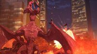 Gyaos can fire their signature Ultrasonic Scalpel (超音波メス Chōonpa Mesu) beams from their mouths, which, unlike previous incarnations, has a red-violet coloration. These beams are incredibly powerful, being able to slice the front of a McDonnell Douglas F-15 Eagle in half and cut into Gamera's hide, with the small Gyaos cutting clean through aircraft and people, while not doing much damage to Gamera. The large Gyaos can cut clean through buildings, and does some noticeable damage to Gamera's face, arms, and plastron, but not his carapace. This incarnation of the attack is noted to be a maser with electric attributes, being fired with electromagnetic energy.[14] The beam generates intense heat even in the surrounding area, such that it can cause the eyeballs of nearby humans to burst and incinerate whole bodies.[15] The attacks can be also used to slice apart targets' corpses to make them easier to feed on.[14] S-Gyaos appears to possess a stronger form of the beam, as it was shown to easily decimate and explode everything in its path.