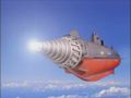 Thankfully, Misato found and boarded the Muan superweapon: the All-Purpose Battleship Gyotengo. Erupting from the cave, she punched a hole in Randeth's barrier with the Gyotengo's drill, then destroyed the vacuum device with a laser.