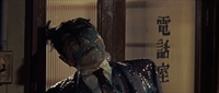 The truth was revealed though while detectives were staking out the Cabaret Homura, a nightclub which they believed was a front for a Yakuza drug dealing ring. The H-Man entered through a window and killed one of the club's waiters and a dancer. Chikako, who worked as a singer at the club, discovered the remains of the H-Man's victims and tried to call for help from a phone booth, only for the H-Man to corner her. Two police detectives, Taguchi and Sakata, saw the H-Man trying to enter the phone booth and opened fire on it. The H-Man transitioned into its humanoid shape and confronted the detectives. Sakata charged at it, but was melted on contact. Alerted to the commotion, the detectives and other witnesses came to the scene and watched as the H-Man retreated. Masada's theory had been proven correct, and he subsequently assembled authorities in his lab and repeated the Liquid Toad experiment to demonstrate the threat posed by the H-Man. Masada's superior at the university, Professor Maki, proposed a plan at a government meeting to hopefully exterminate the H-Man. The H-Man was immune to bullets, but Maki proposed that fire and high-voltage electricity should be able to kill it. Because the H-Man was believed to move using the sewers, a plan was formed to dump gasoline into the sewers and set it ablaze, while using high-voltage electricity to block the creatures from traveling further upstream. Citizens in the staging area were evacuated and the plan was carried out, with firefighters on alert to contain the blaze to waterways only. Meanwhile, the gangster Uchida abducted Chikako and brought her into the sewers where he had stashed his drugs. As Uchida tried to escape the sewers with Chikako through a manhole, he witnessed the H-Man slithering along the wall. He had Chikako leave her shirt behind so that it appeared the H-Man had killed her. After seeing Chikako's shirt float out of the sewers, Masada went in after them while Tominaga tried to find him before he was consumed by the fire. As Uchida continued searching for a way out, he was attacked and killed by the H-Man, while Chikako managed to escape and reunite with Masada. However, both the flames and H-Man were encroaching upon them, and they tried to find an escape. Eventually, they came upon Tominaga and a team of soldiers wielding flamethrowers, who helped them to safety and opened fire on the approaching H-Men. An H-Man slithering across the wall was incinerated by their flamethrowers, while two more materialized in their humanoid shapes in the middle of the sewer tunnel. However, they were quickly consumed by both the fire soldiers' flamethrowers and the stream of fire spreading through the sewer and destroyed. Once the fire had spread through all of the sewers, Professor Maki officially declared to authorities that any H-Man in Tokyo was as good as dead. However, he warned, nuclear weapons had created an environment where the H-Man could thrive, and if their use continued, the H-Man could one day rise again and replace humanity as the dominant species on Earth.
