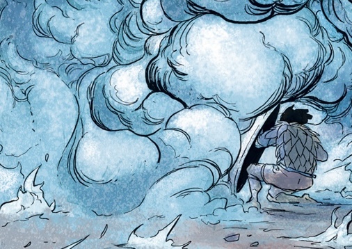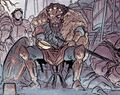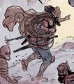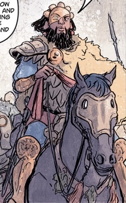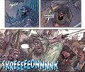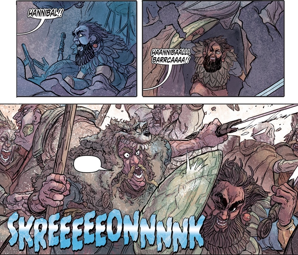 When Godzilla went back on the move the next morning, Hannibal and some of his men chased the monster on their fastest horses. Hannibal climbed onto Godzilla's tail using a grappling hook and plunged his sword down, only for it to shatter on impact. Falling off the monster's tail and fleeing for the life, Hannibal escaped as a blast of atomic breath annihilated the men and horses that went with him. Returning to the rest of his army, Hannibal ordered the disparate mercenary groups he hired to accumulate and follow his path along the river. Hannibal planned to attack Godzilla the same as the Siafu ants do—"as an unbreakable column." Eventually faced with complaints from the mercenary commanders under his employment, Hannibal permitted the army to rest. That night, his forces were ambushed by a Celtic army who he had defeated many times in the past. Godzilla quickly cut the fighting short with a roar and blast of atomic breath, with Hannibal narrowly surviving by taking cover behind a shield. Hannibal angrily looked on at the roaring Godzilla when Maharbal approached him with news about a ravine where they could take refuge. Right as his followers decided to give up and drink away in their seeming final moments, Hannibal barged in on the men with a plan, declaring that he had found their northern passageway. Under his orders, Hannibal's men boiled their supply of wine to make vinegar and brought them to the ravines. Meanwhile, they prepared a catapult with a mass of the dead, tarred and ready for Hannibal to fire. Lighting the bodies aflame and firing the catapult at Godzilla's head, Hannibal happily lead the enraged King of the Monsters to the ravines, barely dodging his attacks in the process. When Hannibal was cornered by the monster, his men rained flaming arrows down on Godzilla's flank, which merited a blast of atomic breath in response. On his command, the soldiers cut loose the vinegar barrels to fall on the flaming stone, creating a massive explosion that brought down the cavern ceiling on top of Godzilla, burying him beneath rubble. Triumphant, Hannibal lead his surviving forces out of the Alps at last, though Maharbal warned him of the cost of their journey through the mountains. As Hannibal sounded his battle horn, a blast of atomic breath cut through the sky before the terrified eyes of the citizens of the nearby Roman city.