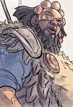 Hannibal is an aged but non-elderly man from Africa, fit and standard in physique. He possesses a long rugged scalp and a full set of facial hair. Hannibal wears a tunic with a blue top and a red bottom, heavily concealed in battle armor and a fur cloak. He dons a scale armor chest plate that covers his torso and shoulders. His lower arms are protected by copper-colored metal armbands, and he wears similar leg-bands on his lower legs that cover the front of his calves and knees. Hannibal's footwear appears to have the same armor covering as his limbs, and he is seen in battle with bronze flat, pronounced pauldrons. On his right side, Hannibal wears a tan shaggy shoulder cloak with a large disk-like clip that matches his metal adornments in color, and on his ear lobes are red circular earrings. Most prominently, Hannibal wears a metal mask that covers part of his face, concealing a massive eye scar that stretches from just below his hairline to his cheekbone. The mask is designed with an eye and an eyebrow as well as five circular extensions at the top, giving Hannibal a complete "face" and a tiara of sorts to reflect his status as a statesman and commander-in-chief.